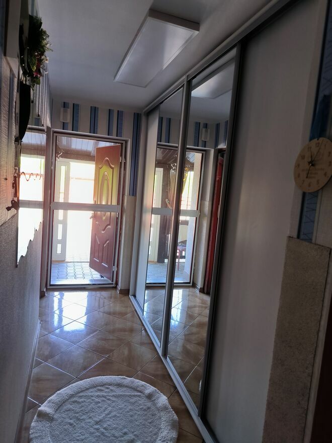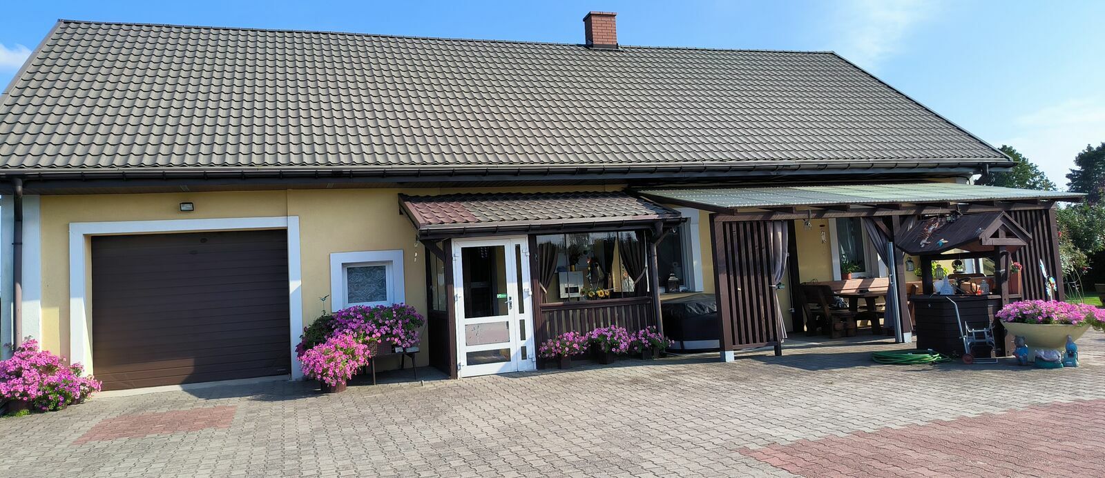 W skład domu wchodzi: na parterze garderoba, kuchnia, 3 pokoje, łazienka z w c, przedpokój z drzwiami prowadzącymi do wyjścia na podwórko i do garażu bez wychodzenia z domu i na schody prowadzące na poddasze z łazienką i 2 pokoje, garderoba, przedpokój duży 3 największy pokój niewykończony. Wyjście na podwórko, przez altankę oszkloną chroniącą przed deszczem i złą pogodą. Nowe zadaszenie przed domem przy altance 7 m głębokie 3,5 drewniane z nowym stołem i ławkami oraz nowe jacuzzi. Z drugiej strony budynku drzwi z osobnym wejściem- może być do piwnicy lub garażu ogrzewanie GAZOWE NOWE oraz nowa fotowoltaika na 9 kw